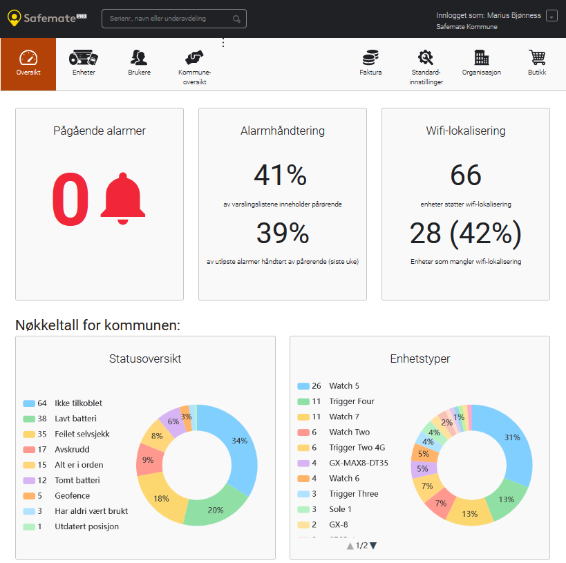 For mange brukere vil startpunktet i Safemate Pro være oversikten. Her vises en overordnet teknisk oversikt over alle enheter som er tilknyttet den eller de ulike underavdelinger i kommunen som du har blitt bemyndiget til å se. Feltene med de forskjellige kategoriene er klikkbare, slik at man raskt kan skaffe seg oversikt over det man er ute etter.