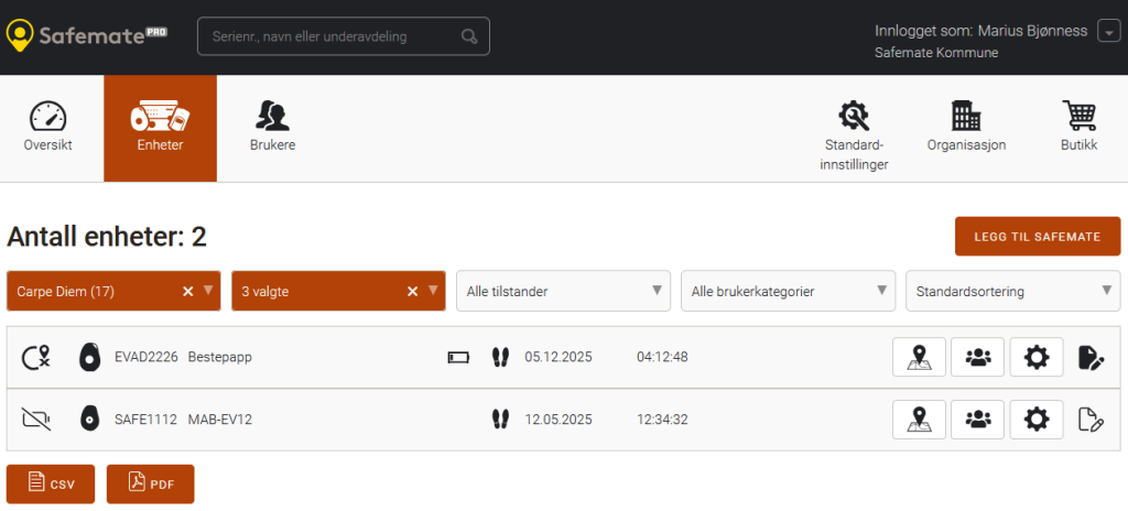 En sentral skjerm i applikasjonen er listen over Safemater, som man kommer til ved å trykke på menyvalg Enheter. Her listes en samlet oversikt over alle de Safemate-enheter som du har adgang til å administrere. Du ser kun de Safemater som er knyttet til de underavdelinger du selv er knyttet til.