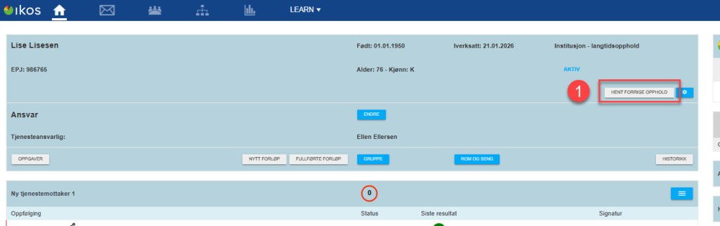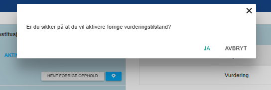 Det er mulig å hente opp forrige opphold på avdelingen om brukeren har vært i avdelingen tidligere. Dette kan være aktuelt ved rullerende opphold, hyppige reinnleggelser eller ved at bruker har blitt avsluttet i avdelinen ved en feil. Da vil sjekklister (med resultater) og helselivssituasjon/prioritetsfarge fra forrige opphold erstatte påbegynt oppfølging.