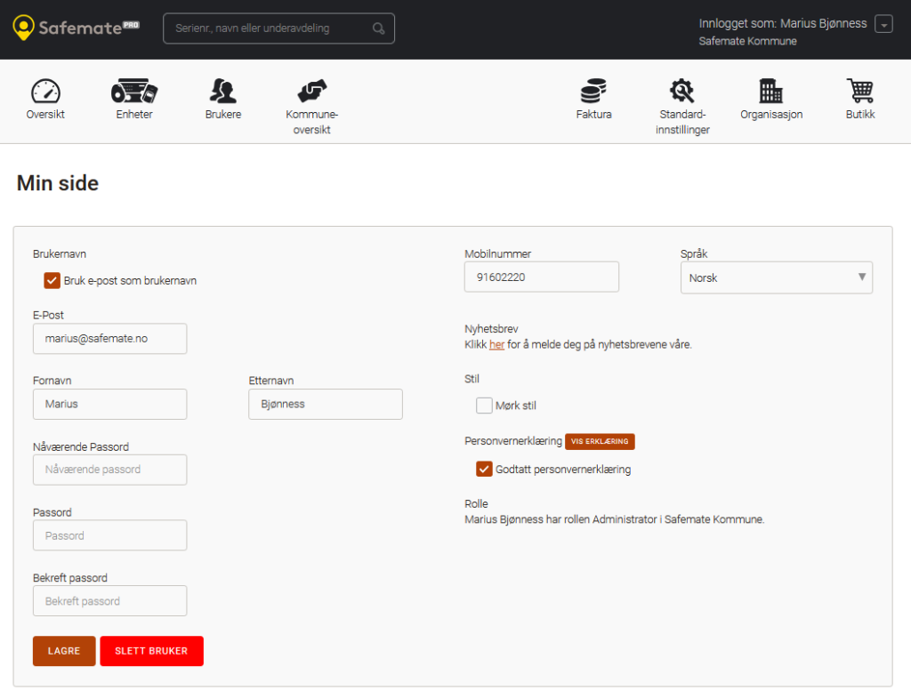 Hver applikasjonsbruker har dessuten en «min side» som man kan nå ved å trykke til høyre for navnet sitt øverst til høyre på skjermen. Der kan man endre passord, språk og bakgrunnsfarge på applikasjonen (blant annet).